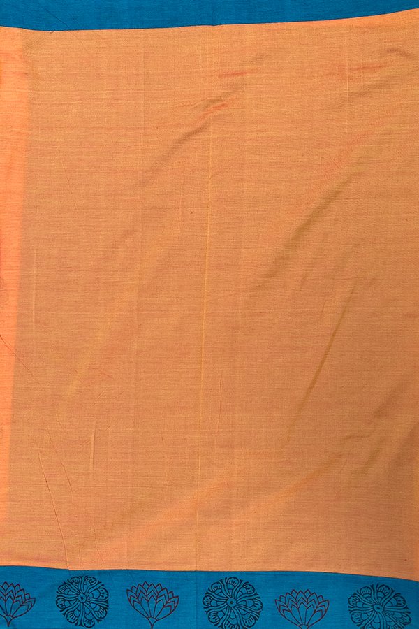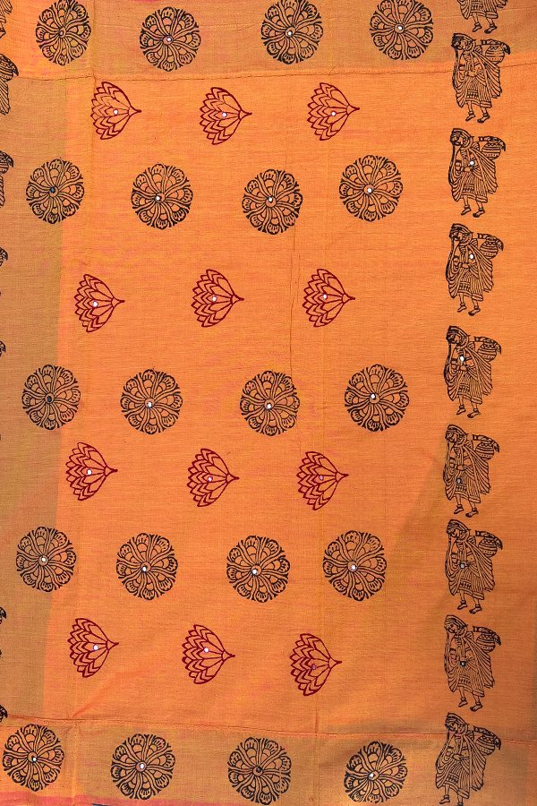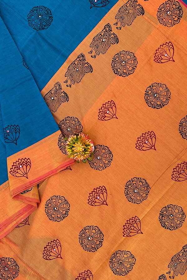 Blue And Orange Printed Cotton Sarees With Mirror work