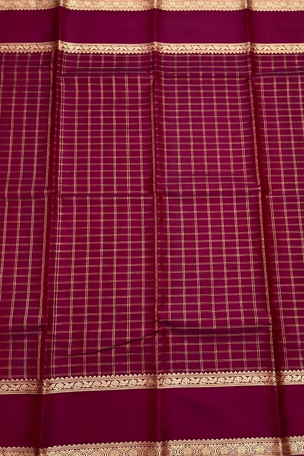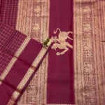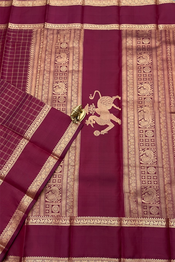 Elevate your festive style with this Kanchipuram Pure Silk Saree in mulberry red, adorned with an elegant golden zari–woven checked pattern across the body. The highlight is its exquisite Navagunjara motif on the pallu, adding a touch of tradition and artistic grandeur to this timeless weave.